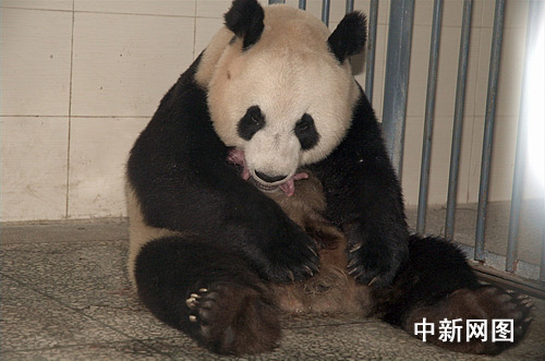 7日晨6點46分,“甜甜”開始出現(xiàn)產(chǎn)前征兆,8點13分破羊水,在經(jīng)過3個多小時的努力后生下一對健康的雙胞胎。初次當(dāng)媽媽的“甜甜”努力嘗試將寶寶叼在懷里,但小仔亂動亂叫,很快又滑落到了地上,經(jīng)過多次努力,小仔終于在媽媽懷里安靜下來,“甜甜”用舌頭輕舔著寶寶的身體,儼然是位稱職的母親。產(chǎn)下第二仔以后,工作人員隨即將第一仔取出送往育嬰室進行人工育幼,經(jīng)初步檢查,該寶寶是雄性,體重146.2克,各項身體指標正常。