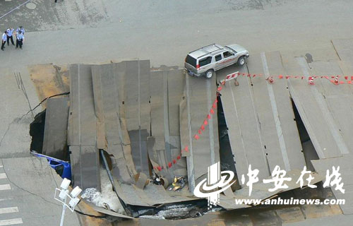 中新網(wǎng)合肥8月8日電(成展鵬 李君)今天中午一點二十分左右,安徽省合肥市長江中路與徽州大道交叉口發(fā)生路面塌陷,塌方面積約半個籃球場大,有一輛汽車傾斜在塌陷洞旁的鋼板上。