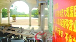 “咦?世界大觀也免費(fèi)了?”昨天上午,在花都上班的馬中華帶著幾個(gè)從老家來(lái)的親戚專(zhuān)程趕到世界大觀游玩,可售票處的窗口緊閉,無(wú)人售票,看到大門(mén)入口處無(wú)人把守,馬中華和幾個(gè)親戚朋友徑直走了進(jìn)去,竟無(wú)人阻攔。不過(guò),在園區(qū)里僅轉(zhuǎn)悠了5分鐘,就被突然沖出來(lái)一個(gè)保安喝止,將馬中華等人趕了出去,“不讓游客進(jìn)了,出去!”記者昨天上午看到,每隔一會(huì)兒就有幾個(gè)市民過(guò)來(lái)想進(jìn)去游玩,但都吃了閉門(mén)羹。
