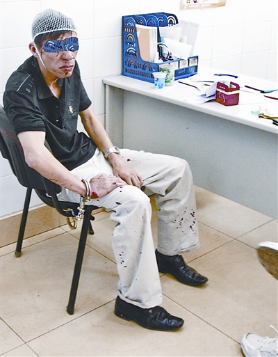 昨日(26日),一血流滿面的中年男人戴著手銬,被警察帶進(jìn)(武漢)市六醫(yī)院急診室,該男子是因偷車而被市民打成這樣的。