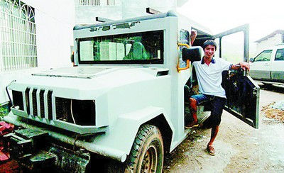 “我是今年4月份開始造這輛車的!比ツ陾顐悅ベI來一輛二手越野車開,車子老是出問題,他便有了自己造一輛車的大膽想法。他從網(wǎng)上下載“悍馬”圖片,一邊研究一邊創(chuàng)新。設(shè)計圖出來了,他拆卸了一輛進(jìn)口三菱車的底盤,買來配件,自己搭造骨架、焊接外殼,他還特地跑到車輛修理廠“偷師學(xué)藝”,終于造出“悍馬”。