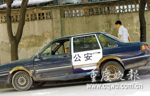 昨上午,記者在天臺崗小學附近,找到了這輛車牌為渝AY1069的“警用”桑塔納。因車身實在怪異,吸引了不少路人觀望,但駕駛員卻毫不在意。記者上前攀談,自稱二手車販的駕駛員爽快的道出了雷人“警車”的來龍去脈。最近,他收購了這輛有11年車齡的桑塔納,因車況太差,只好找了一些舊車部件更新,其中就包括這兩扇來自報廢警車的車門:“現(xiàn)在停在這里,正是因為水箱過熱!