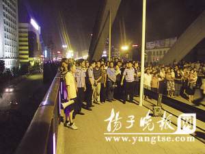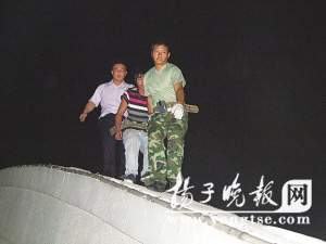 此時(shí),丹陽(yáng)市副市長(zhǎng)、公安局長(zhǎng)張劉茍獲悉后也火速趕到現(xiàn)場(chǎng)指揮救援。由于現(xiàn)場(chǎng)光線(xiàn)不足,救援人員只能模糊地看到高處男子的身影。為了防止男子做出不冷靜的動(dòng)作,救援人員沒(méi)有貿(mào)然行動(dòng),而是在該男子可能掉下來(lái)的地方鋪設(shè)救生氣墊以及架設(shè)起10余張安全網(wǎng)。此時(shí),在云陽(yáng)大橋下的大運(yùn)河中,聞警出動(dòng)的水上派出所的搜救隊(duì)隊(duì)員也已穿好泳衣,隨時(shí)準(zhǔn)備下水救人。海事部門(mén)、路燈管理所和120救援人員也被調(diào)集至現(xiàn)場(chǎng),嚴(yán)陣待命,現(xiàn)場(chǎng)彌漫著緊張氣氛。