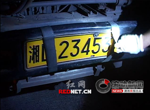 隨后,民警又攔下一輛大貨車。這輛車不僅車尾沒有懸掛號牌,前面也做了手腳。司機用兩副皮筋遮住了前牌照,遮住了末尾一個數(shù)字,還在歸屬地來了個“貍貓換太子”,湘D變成了湘L!