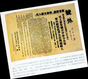 “這本書里我精選了其中的312張?zhí)柾猓渲杏薪夥艖?zhàn)爭時期人民解放軍解放30個省會城市和許多大、中城市時發(fā)行的報紙?zhí)柾猓约啊髴?zhàn)役’、渡江戰(zhàn)役等號外。特別是10多張開國大典號外,見證了毛主席在天安門城樓上宣告‘中華人民共和國中央人民政府已于今日成立了’的偉大歷史性時刻。”張挺自豪地說,書中收藏的大部分號外是首次面世,其中最珍貴的有兩張:一張是1949年4月21日《人民日報》出版的號外“南京國民黨政府拒絕國內(nèi)和平協(xié)定毛主席朱總司令命令全軍堅決徹底干凈全部殲滅敵人”;另一張是1949年4月24日,解放軍攻入太原,當(dāng)日《人民日報》出版“南京反動政府宣告滅亡狼狽奔逃我正向南京急進(jìn)各界已成立治安維持委員會致電毛主席歡迎解放軍入城”的號外。