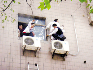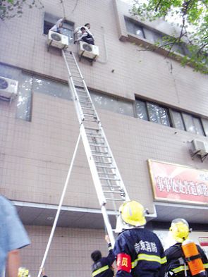 在發(fā)現(xiàn)大樓失火后,商務(wù)樓內(nèi)的物管立即報警求助。2點(diǎn)34分,消防人員、交警和120急救車趕到現(xiàn)場。在商務(wù)樓的西側(cè)兩個窗戶處,有幾位被困在樓內(nèi)的市民被濃煙嗆得站在窗口外呼救,由于煙霧太大,他們不得不爬出窗外,站在墻外的空調(diào)外機(jī)上等待救援。無法站立的這幾位市民一邊用手扶著寫字樓的外墻,兩只腳站在空調(diào)外機(jī)上,這一幕無不讓現(xiàn)場圍觀的群眾為他們捏了一把汗。等到消防隊(duì)員趕到現(xiàn)場之后,立即呼喊他們不要緊張,不要向下跳,在現(xiàn)場架設(shè)了云梯進(jìn)行救援并成功地將四名被困市民解救了下來。