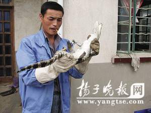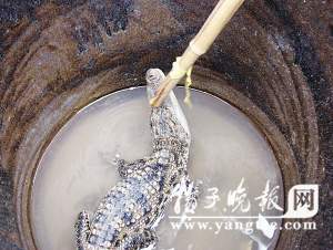 昨天上午,記者接到市民董先生的報料來到了江寧谷里孝義村111號,周國喜正蹲在一個大缸前,旁邊還有幾位村民在指指點點。記者走近一看,只見一只長約80厘米的小鱷魚正在缸底,頭部往上翹,尾部不停地甩動,看上去很緊張。盡管這條小鱷魚給周國喜帶來了不小的損失,可他沒有絲毫的恨意,反倒細心照顧起來。“這個魚塘我一直在養(yǎng)魚,每年2月份和6月份都投放一次魚苗,總共1萬多條,鳊魚、鯽魚都有!敝車舱f,可讓他奇怪的是,產量都不高。周國喜曾研究過多次,可沒有任何結果,這讓他百思不得其解?删驮诮衲8月份的時候,周國喜在清理魚塘時,突然發(fā)現(xiàn)一只小怪物伸出了頭,嘴巴長又尖!熬褪撬耍耶敃r確定魚塘產量不高就是因為這只小怪獸!敝車哺嬖V記者,他自此開始盯著魚塘,可小怪獸很警惕,大都在魚塘底,很難發(fā)現(xiàn)。功夫不負有心人,通過近半個月的觀察,周國喜發(fā)現(xiàn)小怪獸喜歡上岸睡覺,不過是在對岸的水花生上面,很難捕捉!拔舶秃荛L,嘴很尖,身上顏色黃黑相間!敝車舱f第一眼看到小怪獸就覺得像是鱷魚,不過他不敢確認,于是喊來了弟弟,結果弟弟覺得像是國家一級保護動物揚子鱷。