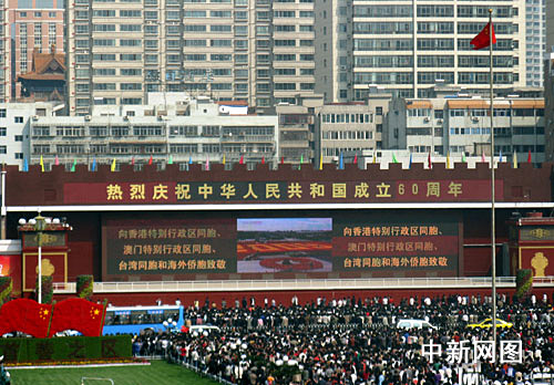 記者上午9時許來到蘭州東方紅廣場看到,這里早已是人山人海,川流不息。10時,當(dāng)黨和國家領(lǐng)導(dǎo)人在首都天安門城樓上的畫面出現(xiàn),此間民眾不約而同的鼓掌歡迎。