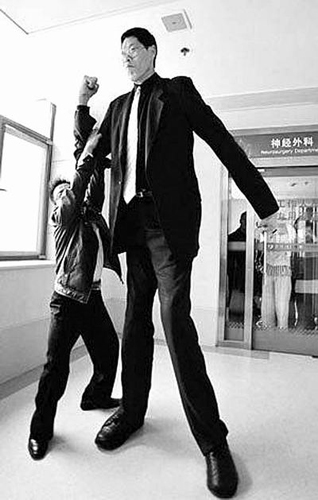 今年27歲的趙亮是濮陽南樂縣梁村鄉(xiāng)西崇町村人,身高2.46米,這一高度比姚明高20厘米、比曾有“世界第一巨人”之稱的鮑喜順還高出10厘米,是名副其實的“第一高人”。趙亮16歲時身高就已達(dá)到1.90米,17歲時被推薦到河南省體;@球隊,在一次扣籃時左腳扭傷,一直未能痊愈。今年4月,天津一家醫(yī)院免費為趙亮進(jìn)行了腳傷手術(shù)。不久,成為媒體關(guān)注焦點的趙亮被歐寶地板聘請,成為公司一名管理人員。上班后,趙亮作為企業(yè)形象大使備受社會關(guān)注。