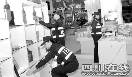 昨晚10點,新會展中心各展館里一片忙碌。在一群正在安檢的帥氣黑衣特警中間,3個扎著發(fā)髻的女特警格外引人注目。除負(fù)責(zé)現(xiàn)場指揮的教導(dǎo)員吳虹外,28歲的羅蕾正用伸縮臂鏡檢測著一食品展臺頭頂?shù)闹,而今年剛(cè)刖闹苋兀瑒t彎腰在一排展柜前仔細(xì)檢查著。和男特警一樣,她們都穿著帥氣的黑色警服,戴著警帽,不施粉黛,右胸前印有“成都特警”4個大字的閃光背心,將她們襯得格外颯爽。