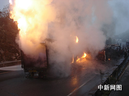 中新網(wǎng)南寧十月十八日電 (王剛 王越川)十八日凌晨三時(shí)許,廣西南丹縣境內(nèi)發(fā)生四車(chē)相撞慘烈事故,造成包括大客車(chē)在內(nèi)的三輛大型車(chē)輛被燒毀,至少十五人受傷,其中三人重傷。