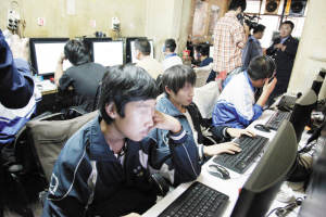 中午11點(diǎn)半左右,網(wǎng)吧涌進(jìn)十幾個(gè)穿著八十九中校服的學(xué)生,孩子們很熟悉地朝胖女子打著招呼,喊了聲“姑姑,開機(jī)”,胖女子便忙活著收過錢后,一一為孩子們開機(jī)。由于機(jī)器有限,沒爭到電腦的學(xué)生只能站在后面一邊看,一邊搭話聊天,不舍得離開。記者看到,為了趕時(shí)間,很多孩子都著帶盒飯,邊吃邊玩。有些沒有帶盒飯的孩子,一邊緊張地打著游戲,一邊叫胖女子泡一碗方便面,匆匆吃幾口,又開始進(jìn)入游戲中。下午4點(diǎn)20分左右,身穿校服的孩子們再次大量涌入,為了不被家長發(fā)現(xiàn),有些孩子甚至將自行車搬進(jìn)了網(wǎng)吧。