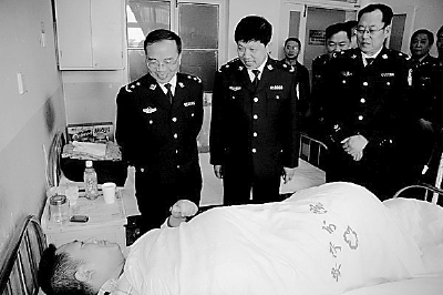 10月16日,省公安廳副廳長、市公安局局長王幸等領(lǐng)導(dǎo)專程趕往醫(yī)院,親切看望和慰問了在抓捕毒販中英勇負傷的禁毒大隊大隊長徐光明。在病房,王幸對徐光明、李剛、劉紅生、王麗萍4名民警的行為給予贊揚,并囑咐他們好好養(yǎng)傷,爭取早日康復(fù)。