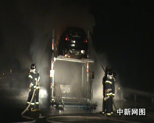中新網(wǎng)淮安10月23日電 (郭志明 衡中強(qiáng) 朱曉穎) 23日凌晨3時(shí)許,江蘇淮安市洪澤消防中隊(duì)接到市支消防指揮中心指令稱,寧連高速向鹽城方向162公里處一拖車自燃,拖車所載的吉利自由觀新車亦被燒毀。消防聞?dòng)嵑笱杆偬幹谩?table border=0 cellspacing=0 cellpadding=0 align=left>