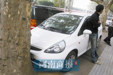 昨天上午10時許,小王從金水路與經(jīng)五路交叉口往北走,聽見幾個人在爭論。湊過去一看,有輛白色本田車頭緊貼一棵法桐,幾個人正爭論車頭是否挨上了樹。