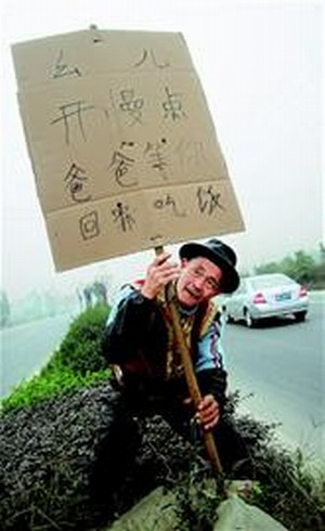黑幕降臨,成青金快速通道梁勝村路口邊的平房?jī)?nèi),32歲的廖大姐正在灶房里做飯,5歲的女兒唱著歌溜出屋。突然一陣刺耳的剎車聲響起。廖大姐如觸電一般,手中菜刀墜落在地。奔出門外,見(jiàn)女兒并未走近路口,一把將其緊緊抱住……3天內(nèi),這個(gè)路口就吞掉了兩條人命。兩年多來(lái),僅梁勝村就有8名村民在此路口丟了性命,被稱為“死亡路口”,在反映10余次無(wú)果后,昨(8)日,該村60歲的“弼馬溫”董永發(fā)將親手制作的警示牌立在了路口:“幺兒,開(kāi)慢點(diǎn),爸爸等你回家吃飯!”
