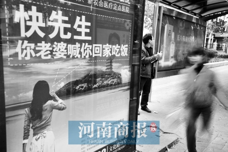 鄭州的農(nóng)業(yè)路、文化路、二七路等繁華路段、公交站臺(tái)新近出現(xiàn)了許多廣告牌,什么“肛腸泌尿”、“豐胸整形”、“無(wú)痛流產(chǎn)”……種類(lèi)繁多,最引人注目的是一個(gè)畫(huà)面上一位妙齡女士在大喊“快先生,你老婆喊你回家吃飯”的廣告。