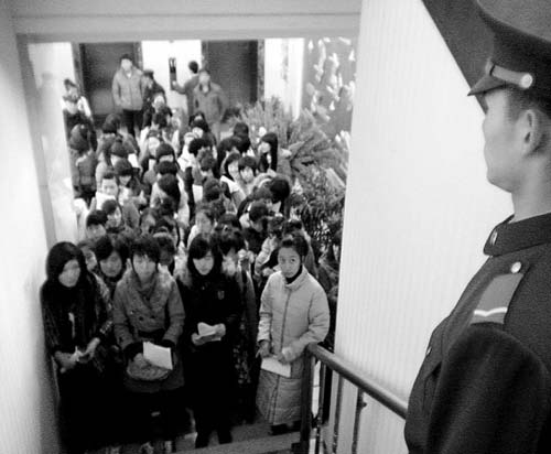 當(dāng)記者進(jìn)入鴻翔賓館一樓大廳時(shí),前來(lái)報(bào)名的女孩和家長(zhǎng)們將這里擠得水泄不通。在賓館二樓,沈陽(yáng)警備區(qū)的工作人員正在做著準(zhǔn)備工作!皥(bào)名開始后,我們將進(jìn)行分類,在校大學(xué)生將走一個(gè)門報(bào)名,應(yīng)屆畢業(yè)生將走另一個(gè)門!