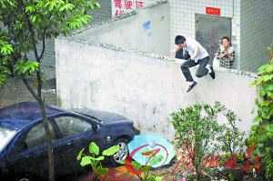 昨日上午8時許,大雨。禪城區(qū)教子村外墻邊突然響起了汽車的連續(xù)報警聲。記者尋聲望去,只見教子村的一個外墻,站著一群年輕人,其中墻內(nèi)還有數(shù)名男男女女正準備越墻而出。