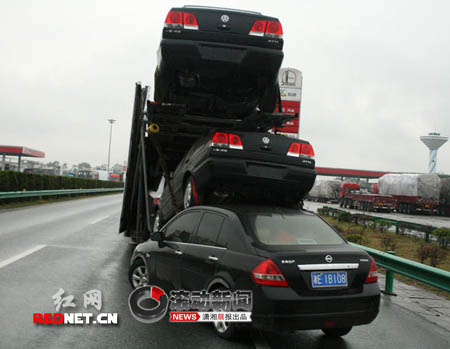 當(dāng)日下午4點(diǎn)20分左右,高速交警邵懷大隊(duì)隆回中隊(duì)民警黃始杰、羅權(quán)趕到事發(fā)現(xiàn)場,在由東往西方向的洞口服務(wù)區(qū)入口處,一輛牌號為湘E1B1**的尼桑小車一頭撞進(jìn)牌號為吉A955**的掛車尾部,將掛車車尾所裝載的捷達(dá)小車高高的頂起,而尼桑小車的左前輪在劇烈的撞擊下已經(jīng)破裂。