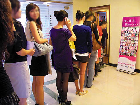 記者在面試現(xiàn)場(chǎng)看到,當(dāng)天前來(lái)應(yīng)征的靚女當(dāng)中,絕大多數(shù)在首輪就被淘汰,進(jìn)入到第二輪的只有五名。這五名中又有三位在過(guò)第三關(guān)———面談關(guān)時(shí)被淘汰了,只有兩人獲得與富豪見(jiàn)面的機(jī)會(huì)。三位靚女被淘汰的原因很簡(jiǎn)單,一位因家里是母親做主,被認(rèn)為“太強(qiáng)勢(shì)”,不合要求;一位因有“許多個(gè)男性朋友”,被認(rèn)為用情太泛、不專(zhuān)一,被淘汰;還有一位是因?yàn)榇虬绮坏皿w、談吐大大咧咧,也被認(rèn)為不合要求。 應(yīng)征動(dòng)機(jī),多否認(rèn)“逐富”