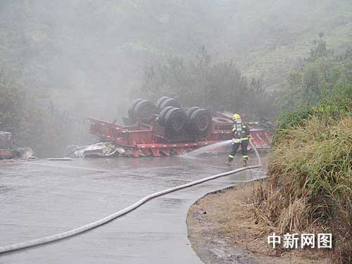 見此情況后,中隊指揮員對事故現(xiàn)場立即進行警戒,出兩支水槍進行稀釋。樂清市政府得悉情況后,立即起動應急預案,并調(diào)集公安、安監(jiān)、環(huán)保、交通、路政等相關(guān)部門趕赴現(xiàn)場處置。