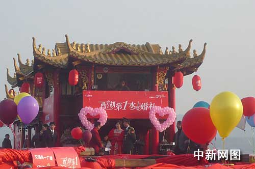 遲來的婚禮將讓姚春曉和新娘終身難忘。今天的水上婚禮在一條浪漫的畫舫上進行,畫舫的周圍還簇?fù)碇?00艘掛滿紅燈籠的劃船,儼然像是被紅綢包裹著的白堤。