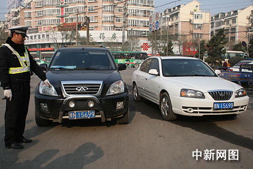 當(dāng)日上午9時(shí)10分,正在文化路崗執(zhí)勤的交警二大隊(duì)民警李磊看到一中年人急匆匆向他跑來,“民警同志,快攔住這輛等紅燈的奇瑞車,它掛的牌照和我的一樣,是一輛套牌車!泵窬(dāng)事人的手指的方向望去,果然見一前一后停著兩輛轎車,前車是一輛黑色奇瑞,后面是一輛白色現(xiàn)代,而兩車的號牌都是予N15699。