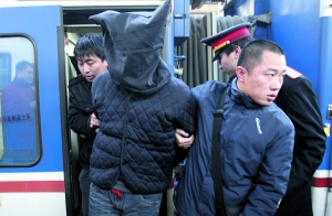 昨日上午,T232次列車進(jìn)站,旅客中有一群戴著手銬、蒙著頭套的特殊旅客,他們?cè)诿窬垂芟卤谎荷暇嚒?/p>