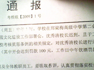 11日下午1時(shí),淮安市漣水縣鄭梁梅高級(jí)中學(xué)開會(huì),校長沈秀清因遲到且當(dāng)日中午飲酒,被該校崗位獎(jiǎng)懲考核組罰款600元,并通報(bào)批評(píng)。事情發(fā)生后,有網(wǎng)友將該校對(duì)沈校長的《通報(bào)》發(fā)到網(wǎng)上,一時(shí)間,網(wǎng)友對(duì)該通報(bào)的真實(shí)性及校長是以身作則、還是校方自我炒作提出質(zhì)疑。