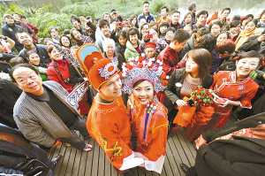 下午5時(shí),巴國城公園涼亭,嗩吶鑼鼓齊鳴,來自美國堪薩斯州的新郎喬納森頭戴紗帽、身穿大紅官袍登場,重慶新娘徐閃鳳冠霞帔,臉頰微紅。新人亮相,親友陣陣歡呼,“洋婆婆”上前拉著兒媳婦的手,激動(dòng)得不住地說:“You are beautiful girl(你是一個(gè)美麗的女孩)……”