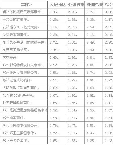 中新網(wǎng)鄭州1月11電(記者 師紅壘)2009年,河南網(wǎng)民都關(guān)心什么,重大事件的處是中,官方的應(yīng)對能力又怎樣。1月 10日,一份由某網(wǎng)站公布的河南《公共事件熱度排行榜》和《官方應(yīng)對能力排行榜》調(diào)查報(bào)告,再次引起網(wǎng)民關(guān)注。