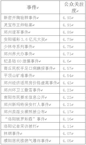 據(jù)了解,該報(bào)告的自2009年12月14日開始,歷時(shí)近一月,共有10078名網(wǎng)友參與打分。報(bào)告業(yè)示,2009年度發(fā)生在河南境內(nèi)具有較大影響力的18個(gè)公共事件,新密開胸驗(yàn)肺事件和靈寶市王帥帖案名列榜首,而在重大事件的處理上,網(wǎng)民認(rèn)為濮陽居民樓燃?xì)獗ㄊ录,?dāng)?shù)卣幚碜顬榈卯?dāng)、及時(shí),受到網(wǎng)民一致好評。