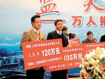 據(jù)介紹,青浦此次舉行的“慈善一日捐”活動募得的善款,是該區(qū)歷年募捐總額的2.8倍,創(chuàng)歷史新高。在參與捐贈的700余家單位中,景港控股集團捐贈1000萬元;青浦工業(yè)園區(qū)、上海徐涇建筑工程有限公司、上海豪都房地產(chǎn)開發(fā)經(jīng)營有限公司等18家單位捐贈了100萬元以上。(談燕)