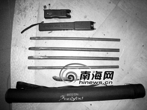 “你隨身攜帶的電棍做什么用的?還自制開鎖器?” 記者在瓊?词厮姷皆谘旱暮沃铱。何說,電棍有電擊功能又有照明功能,攜帶電棍用來防身,如果被人發(fā)現(xiàn),他們便用電棍電擊他人,同時在作案時用來照明。