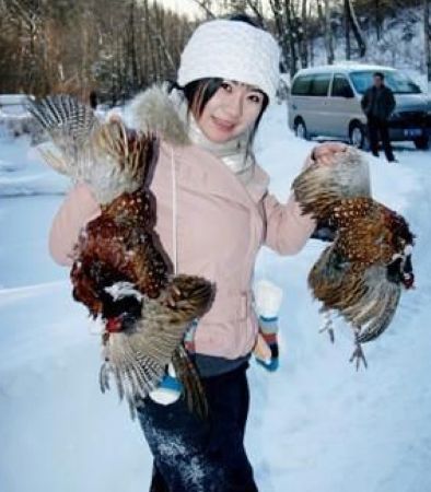 網(wǎng)帖中的女主角五官清秀、打扮入時,她雙手提著中彈的野雞,對著鏡頭一臉微笑地擺起了POSE。另一張照片是特寫,“狩獵女”的淡粉色外套沾滿了獵物的血跡。