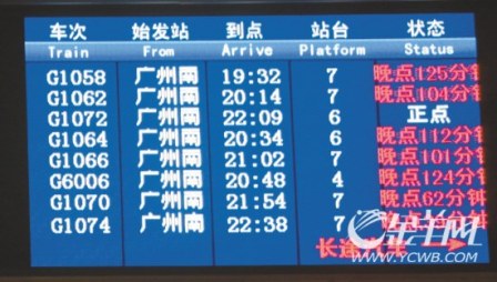 到晚上6時30分,現(xiàn)場LED顯示屏顯示,從原定下午5時06分發(fā)出的9個班次列車都處于晚點狀態(tài)中,車站所有站臺上都沒有列車?,數(shù)千旅客因此滯留廣州南站內。