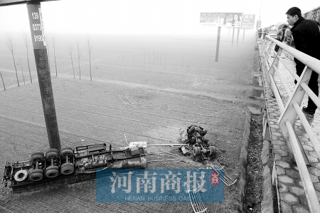 昨日凌晨5時(shí)許,黃河大橋上一公里內(nèi),一輛煤車(chē)、一輛貨車(chē)和一輛油罐車(chē)分別沖斷護(hù)欄墜入橋下。據(jù)民警介紹,事故原因疑是橋面結(jié)薄冰導(dǎo)致路面濕滑所致。