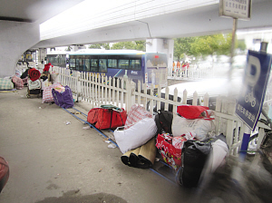 市場關(guān)門放假之后,那些滯留在門口的民工只好收拾好行囊,和其他工友聯(lián)系住處。一位安徽籍民工告訴記者,他和其他幾個老鄉(xiāng)準備去另一個老鄉(xiāng)打工的工地那里暫時住兩天。放假了工地也停工,但是住的地方還是有的。而還有一些民工索性又將行李搬到了安德門地鐵站附近的高架橋下,“現(xiàn)在工作也不好找,住旅館實在太貴,我們只好再住回高架橋下。”民工們搬進高架橋下后,個個哀聲嘆氣,但也有一些情緒樂觀的,跑進了地鐵站內(nèi)打撲克取暖消遣。(記者 曹盧杰 裴睿)
