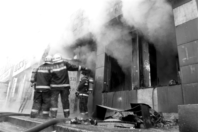 7時(shí)許,記者在現(xiàn)場(chǎng)看到,一家經(jīng)營變頻器的門市房?jī)?nèi)冒出滾滾濃煙,火借風(fēng)勢(shì)很快將樓上一家旅店引燃,消防人員正在二層破拆打水撲救,并迅速將屋內(nèi)的煤氣罐轉(zhuǎn)移,二層的近10扇窗戶玻璃被擊碎排煙。經(jīng)過兩個(gè)小時(shí)的救援,火勢(shì)被控制住。此時(shí),門市房受損嚴(yán)重,室內(nèi)的物品被燒焦,窗戶玻璃破碎。人行道及車行道上的積水結(jié)了一層薄冰。