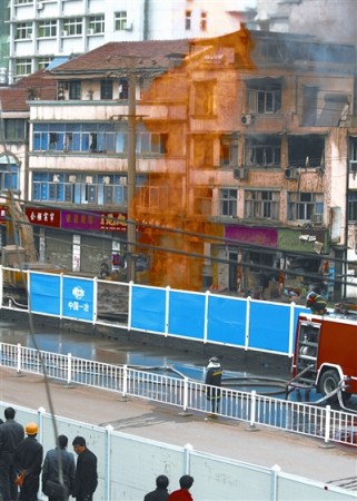 昨日被挖破的管道,就坐落在黃浦大街246號一棟4層樓的私房門前,該私房底層是三間臨街的門面,樓上住著兩戶人家還有兩位老人,眾人顧不得收拾家中財物趕緊往外撤。鄒姓房東告訴記者,該棟樓的一半財物基本都在大火中被燒毀,他一大家子人沒地方過夜,被安排到近旁的揚子江飯店落腳。