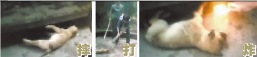 視頻不長,但實在令人揪心。被虐小狗是一條黃色小狗,從視頻一開始到結束都在承受地獄般的摧殘:身著橫條紋上衣的男生提著小狗用力摔下約2米高的階梯。“死沒?”“沒有,還在出氣。”“哈哈哈。打死,打死來吃。”小狗慘叫了兩聲,躺在地上不能動彈,從拉近的視頻鏡頭可以看到,它在急促地呼吸。“用火炮炸它!”畫面外,一個男生的聲音尖叫道。緊接著,“橫條紋”將幾個鞭炮塞進小狗嘴里,用打火機點燃后跑開!鞍、叭、叭”三聲清脆的鞭炮相繼響起,視頻中同時傳出了幾個男生瘋狂的笑聲。