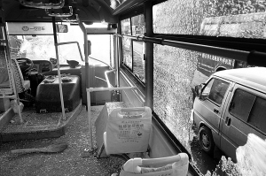 昨日17時,記者趕到現(xiàn)場。為了不使被砸的這輛25路公交車影響其它公交車發(fā)車,該車已經(jīng)從站點移開。被砸公交車的前風(fēng)擋玻璃、前車門玻璃以及車兩側(cè)近10塊車玻璃被砸碎,車內(nèi)滿地是玻璃碎片。