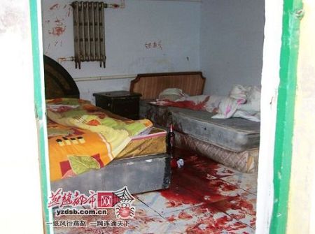 據(jù)旅店老板介紹,12日下午三點(diǎn)多,她看到小明小亮居住的房間門前有幾個(gè)血腳印,心里想這是怎么了,就上前敲門,里面的人不開(kāi)門,她繼續(xù)敲門,門終于開(kāi)了,她也被眼前的場(chǎng)景驚呆了:“屋子里的血流了一地,其間還夾雜著醉酒的嘔吐物,大片的血跡中間是兩個(gè)啤酒瓶子。兩個(gè)男孩一個(gè)蹲坐在地上,一個(gè)坐在床上,一邊墻上用血寫著‘XX,我愛(ài)你’,一邊寫著‘我錯(cuò)了,我愛(ài)你……’ ”