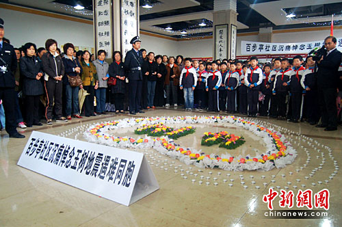 上午10時,數(shù)百名武漢百步亭居民、育才小學學生代表有序來到社區(qū)活動中心。在工作人員的引導下,他們靜靜地圍繞著用鮮花扎成的“4.14之心”分排站好,手捧蠟燭,向遇難同胞默哀;顒蝇F(xiàn)場,居民自發(fā)手折紙鶴,以此寄托對災區(qū)民眾的牽掛與祝愿。