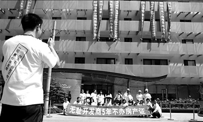 昨天上午,數(shù)十業(yè)主統(tǒng)一著裝聚在公寓大門前,并在樓前掛出橫幅,聲討開(kāi)發(fā)商不給房產(chǎn)證等惡劣行徑。多名業(yè)主表示,他們是近幾年來(lái)陸續(xù)入住該公寓的,但都未獲得房產(chǎn)證,拉橫幅集體抗議實(shí)屬無(wú)奈。記者多次聯(lián)系開(kāi)發(fā)商一方,均被告知不便回答或拒絕采訪。