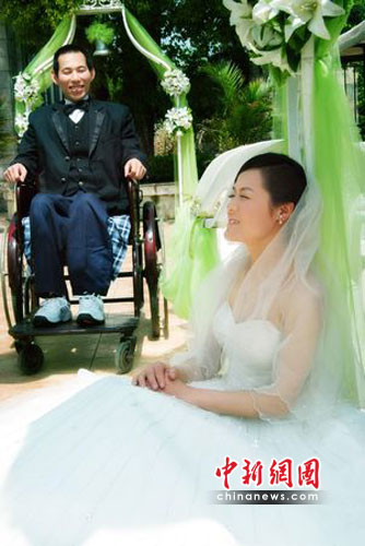 中新網(wǎng)徐州5月7日電 (記者 邵國(guó)棟 董敏)拍攝一套婚紗照對(duì)結(jié)婚新人是一件再普通不過(guò)的事了,但是對(duì)于江蘇銅山縣大彭鎮(zhèn)34歲高位截癱的范進(jìn)來(lái)說(shuō),卻是一件不可能做到的事情。為了幫這對(duì)特殊的新人圓夢(mèng),徐州市眾多影樓紛紛伸出愛(ài)心之手,愿意為他們免費(fèi)拍攝婚紗照。6日下午,在徐州市新新娘婚紗影樓大廳,記者見(jiàn)到了范進(jìn)和他的妻子李美玲。“自從癱瘓后就沒(méi)想過(guò)結(jié)婚一事,更別說(shuō)拍婚紗照了!”范進(jìn)這樣對(duì)記者說(shuō)。