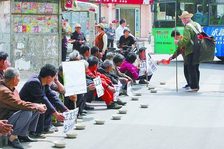昨日上午,東風(fēng)路省中醫(yī)院門(mén)前,30名農(nóng)民工手持瓷碗,在路邊排成一行乞討,不少市民出于同情,為農(nóng)民工留下一些零錢(qián)。