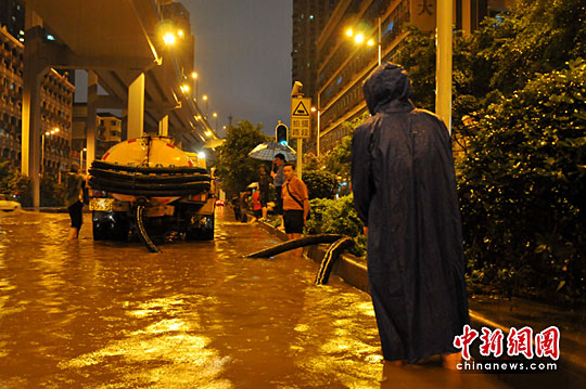 在“水浸黑點”之一中山一路現(xiàn)場,有多位環(huán)衛(wèi)工人被臨時抽調(diào)過來協(xié)助排水,其中一位工作人員黃叔對筆者說:“雨下的這么大,市政也沒有辦法,只能派抽水車過來協(xié)助排水,已經(jīng)來回好幾趟了,但是還沒能那么快抽完。這水還不知道什么時候才能退。”“我們是臨時抽調(diào)過來協(xié)助排水的,已經(jīng)加班了好幾個小時了!秉S叔一臉無奈的說。