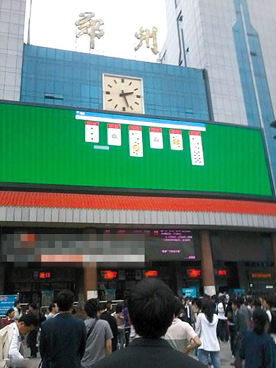 5月16日,鄭州火車站本該顯示車站公告的戶外超大顯示屏上,卻出現(xiàn)了紙牌游戲(見圖),共耗時20來分鐘,游戲過關(guān)后,綠色屏幕上煙花襯著“你贏了”三字。鄭州火車站表示當(dāng)時打牌的人不是火車站的工作人員,是施工方的。據(jù)瀟湘晨報報道,昨晚,河南本地一公司宣稱對此事負責(zé)并致歉。